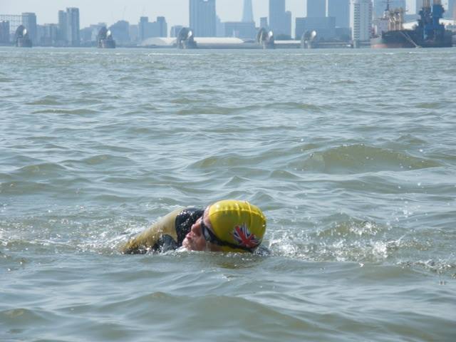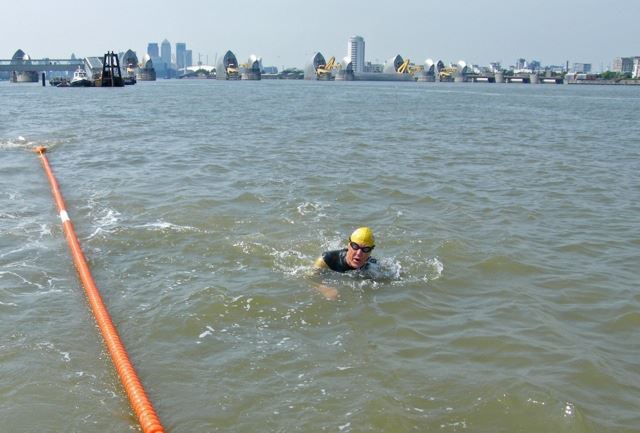 Have you ever driven over the QEII Bridge? Take the opportunity next time to look down at the River to get some idea of the of the immensity of Andy's swim. Look at the length of the River either sid eof the Bridge. You see him here about to swim under the Bridge. Has anyone ever swum under the Bridge before? We don't think so, but do tell us if you know anything different! |