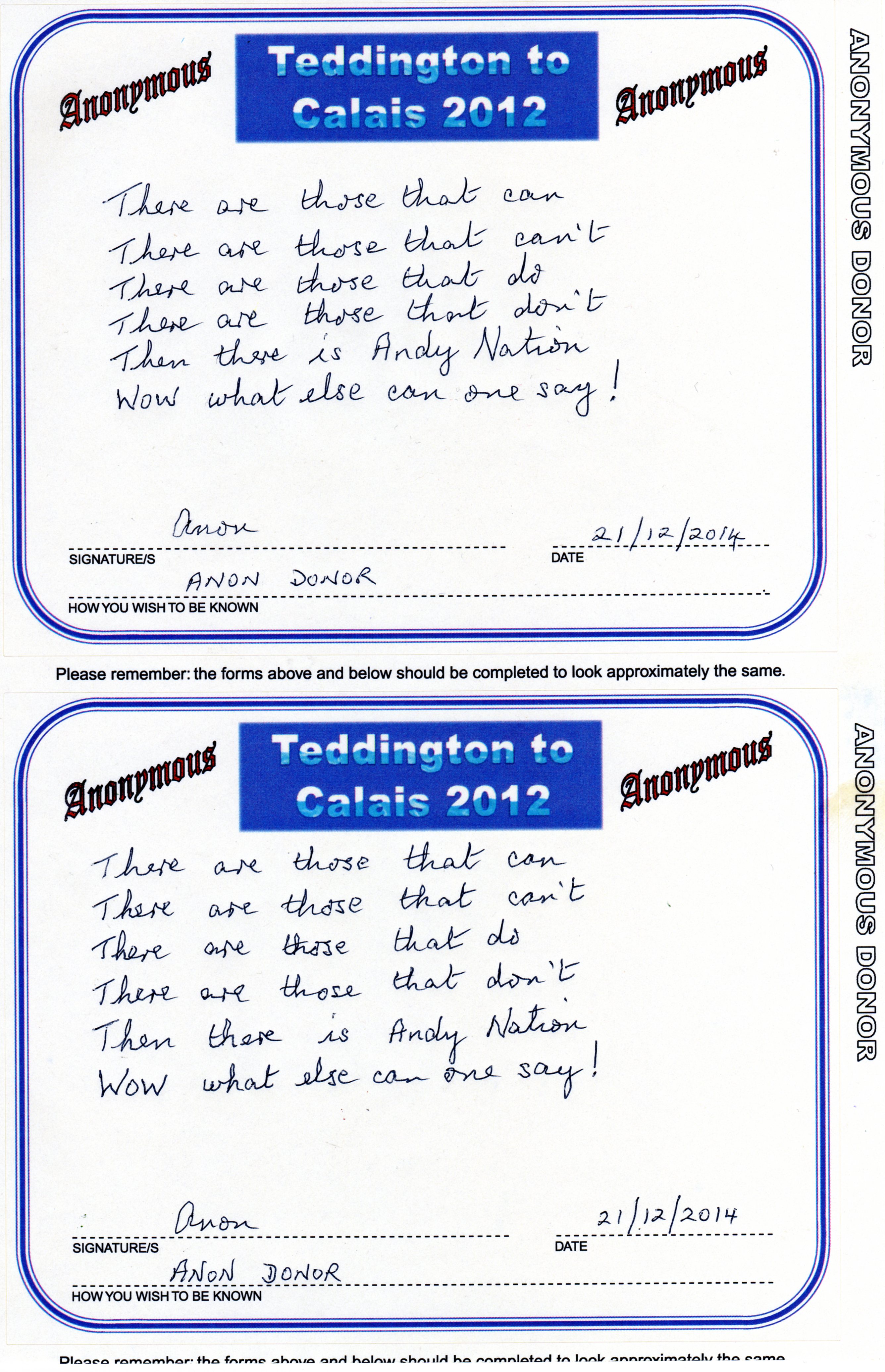 EXAMPLES OF ANONYMOUS ENTRIES Please remember that you will need to submit 2 copies of your entry - one for the Book that will be auctioned for the charities and one for the reference book. Both Books will use only original entries. We can either supply you with a pair of pre-printed and personalized entry labels or you can download and print the same format onto your own paper and we will cut them out and paste onto the page for insertion into the Book of 'People of Our Time'. If you choose the latter then please use a good quality 100gsm, white, A4 paper. For the time being the examples below are ficticious and for illustration purposes only. When entries start coming in we may change the examples below for real examples. Your 2 completed entries should be sent to; Teddington to Calais 2012, The Poolhouse, 6 Deards End Lane, Knebworth, Hertfordshire, SG3 6NL, England. As you are making a sponsorship donation you should include your cheque, or payment reference, inluding date and method, of your electronic donation. If you are making a pledge at this time, we look forward to receiving your payment soon after the event. |