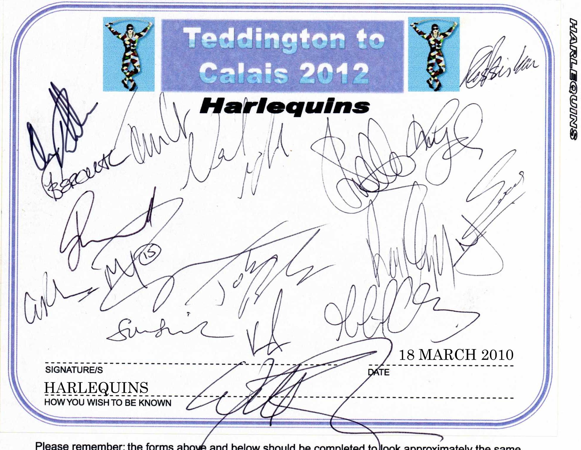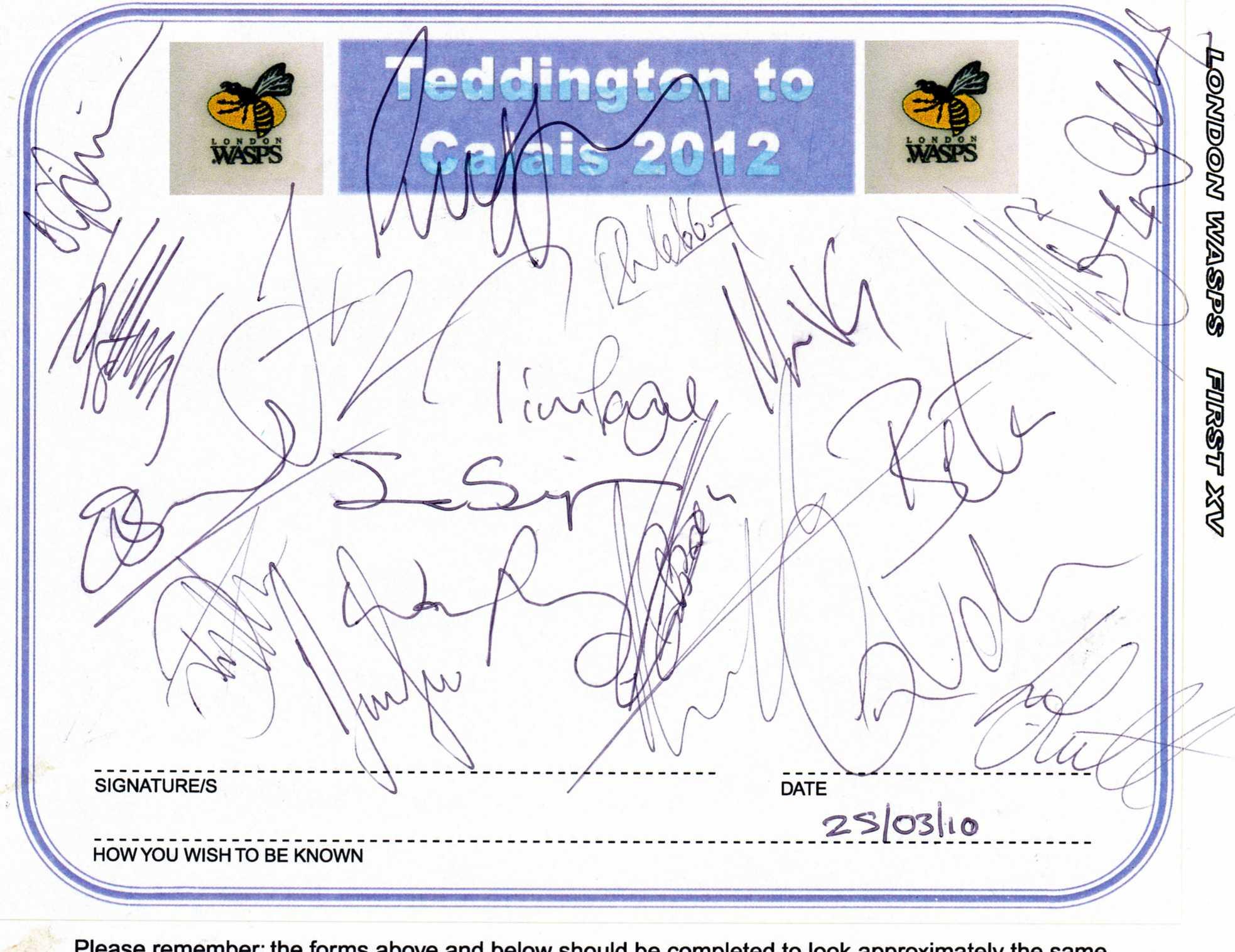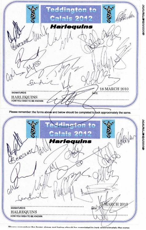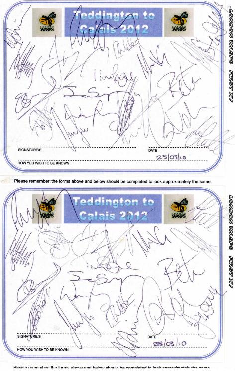 EXAMPLES OF CLUB/TEAM ENTRIES Please remember that you will need to submit 2 copies of your entries - one for the Book that will be auctioned for the charities and one for the reference Book. Both Books will use only original entries. We can either supply you with a pair of pre-printed, personalized self-ahesive entry labels or alternatively, you can download and print the same preformatted labels onto your own paper and we will cut them out and paste them onto the pages for insertion into the Books of 'People of Our Time'. If you choose the latter then please use a good quality 100gsm, white, A4 paper. If you would like us to send the pre-printed labels please do so via the 'Contact Us' page or by post to the address below. Feel free to personalise the entry forms in any way you please and to add any personal message (as humorous and original as you like). Your 2 completed entry forms should be sent to; Teddington to Calais 2012, The Poolhouse, 6 Deards End Lane, Knebworth, Hertfordshire, SG3 6NL, England. If you are making a sponsorship donation you should include your cheque, or payment reference, inluding date and method, of your electronic donation. If you are making a pledge at this time, we look forward to receiving your payment after the event. |