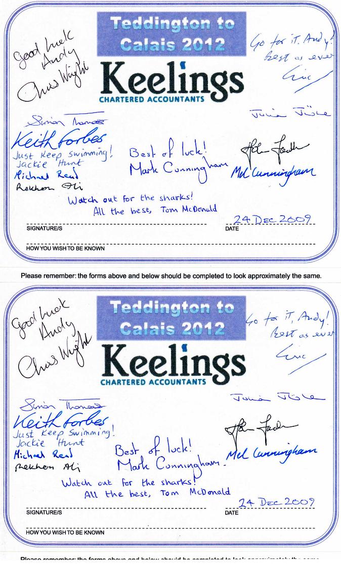 EXAMPLES OF CORPORATE ENTRIES Please remember that you will need to submit 2 copies of your entry - one for the Book that will be auctioned for the charities and one for the reference copy. Both Books will use only original entries. We can either supply you with a pair of pre-printed, personalized self-ahesive entry labels or alternatively, you can download and print the same preformatted labels onto your own paper and we will cut them out and paste them onto the pages for insertion into the Books. If you choose the latter then please use a good quality 100gsm or heavier, white, A4 paper. If you would like us to send the pre-printed labels please do so via the 'Contact Us' page or by post to the address below. The area on the entry label is yours to embelish as you like, so be adventurous and make the most of your brand and corporate identity. Your pair of completed entries should be sent to; Teddington to Calais 2012, The Poolhouse, 6 Deards End Lane, Knebworth, Hertfordshire, SG3 6NL, England. When making your sponsorship donation you should include your cheque, or payment reference, inluding date and method, of your electronic donation. If you are making a pledge at this time, we look forward to receiving your payment after the event. |