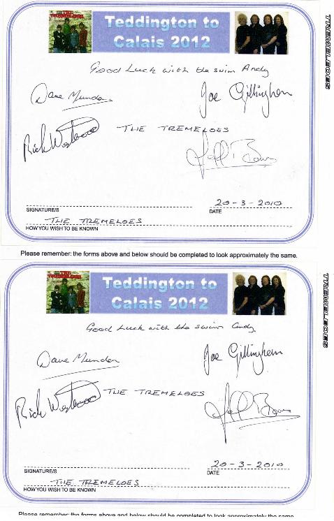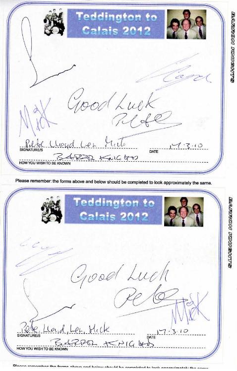 EXAMPLES OF GROUP ENTRIES Please remember that you will need to submit 2 copies of your entry - one for the book that will be auctioned for the charities and one for the reference book. We can either supply you with a pair of pre-printed, personalized self-ahesive entry labels or alternatively, you can download and print the same preformatted labels onto your own paper and we will cut them out and paste them onto the pages for insertion into the Books. If you choose the latter then please use a good quality 100gsm, white, A4 paper. If you would like us to send the pre-printed labels please do so via the 'Contact Us' page or by post to the address below. Feel free to personalise the entry forms in any way you please and to add any personal message (as humorous and original as you like). Your 2 completed entry forms should be sent to; Teddington to Calais 2012, The Poolhouse, 6 Deards End Lane, Knebworth, Hertfordshire, SG3 6NL, England. If you are making a sponsorship donation you should include your cheque, or payment reference, inluding date and method, of your electronic donation. If you are making a pledge at this time, we look forward to receiving your payment after the event. |