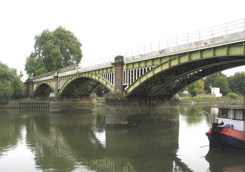 This bridge was opened in 1869. It consists of five wrought Iron lattice girder spans of 35 metres each. The cast iron piers are decorated in three stages and can be seen from inside a passing train. The bridge carries 2 tracks which are electrified with both third rail and London Underground style fourth rail . It runs between Kew and Strand on the Green, Chiswick. Just upstream of the railway bridge is Oliver Island.