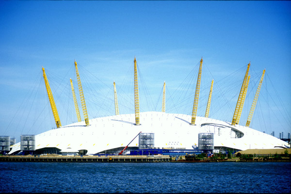 The Millennium Dome , often referred to simply as The Dome , is the original name of a large dome -shaped building, originally used to house the Millennium Experience , a major exhibition celebrating the beginning of the third millennium . Located on the Greenwich Peninsula in South East London , the exhibition opened to the public on 1 January 2000 and ran until 31 December 2000. The project and exhibition was the subject of considerable political controversy as it failed to attract the number of visitors anticipated, leading to recurring financial problems. While all of the original exhibition and associated complex has since been demolished, the canopy or shell of the dome still exists, and it is now a key exterior feature of the The O 2 entertainment district. |